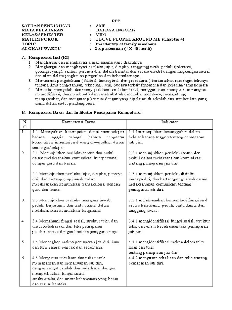 Kemendikbud, jakarta, 2017 kompetensi dasar 3.1 "menerapkan fungsi sosial, struktur teks, dan unsur kebahasaan teks interaksi transaksional lisan dan tulis yang melibatkan tindakan memberi dan meminta informasi terkait jati diri dan hubungan keluarga, sesuai dengan konteks penggunaannya. Kd ki yang akan kita pelajari adalahkompetensi dasar:3.1 menerapkan fungsi sosial, struktur teks, dan unsur kebahasaan teks interaksi transaksional lisan dan tulis yang melibatkan tindakan memberi dan meminta informasi terkait jati diri dan. 4 x pertemuan (12 jp) kompetensiinti. Informasi terkait jati diri dan hubungan keluarga, sesuai dengan konteks. Makna, tujuan komunikasi, struktur teks, dan unsur bahasa yang terdapat dalam teks interaksi transaksional lisan dan tulis yang terkait dengan jati diri dan hubungan keluarga sesuai dengan konteks penggunaan serta mampu meminta dan memberi informasi tentang jati diri dan hubungan keluarga dengan menggunakan struktur teks yang tepat sesuai Kata kata bijak tentang mencari jati diri sendiri. We did not find results for: Teks pemaparan jati diri (introductional text) untuk kelas 7 smp merupakan teks yang berisi tentang pemaparan jati diri. Berikut adalah soal bahasa inggris kelas x semester 1, selamat mengerjakan. 2.2.4 bertanggung jawab atas tugas yang dikerjakan secara mandiri atau kelompok. Oke buat sahabat sbi yang super. Sekolah menengah atas negeri jogoroto. Menghayati dan mengamalkan ajaran agama yang dianutnya ki 2.